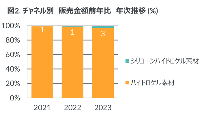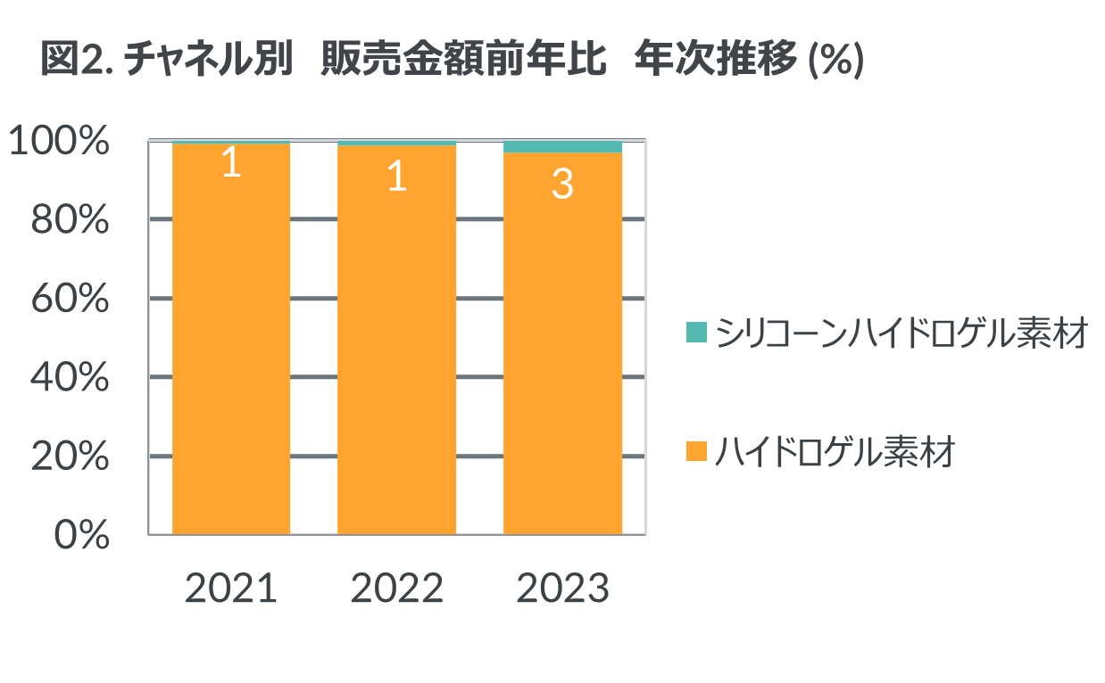 眼の健康に良いとされる、シリコーンハイドロゲル素材の新製品発売が続いている。従来のハイドロゲル素材よりもプレミアムな素材・価格としてクリアレンズでは一般的な素材となっているが、カラー・サークルレンズ市場ではまだその規模は小さく、製品数も少ない。一方で、人気製品シリーズから新たにシリコーンハイドロゲル素材のタイプが発売されるなど、製品のラインナップ拡大の動きが見られている。素材別の金額構成比を見ると、ハイドロゲル素材が主流であることは変わらないが、徐々にシリコーンハイドロゲル素材の構成比が増加している(図2)。カラー・サークルレンズにおいても定着していくのか今後が注目される。