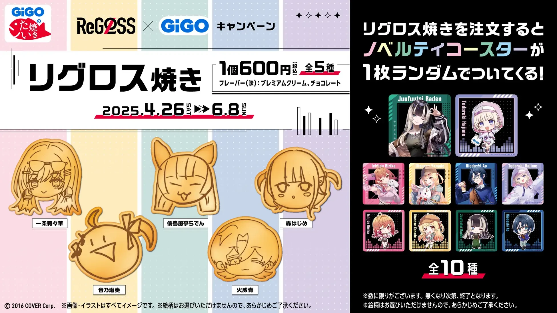 GiGOのたい焼きにて、ReGLOSSメンバー描き下ろしのコラボたい焼き 「リグロス焼き」を販売いたします。1個お求めの方に、オリジナルコースター(全10種/ランダム)を1つプレゼント!