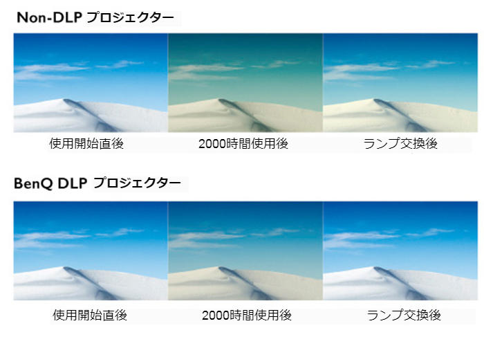 長期間使用後に黄ばんでしまう他の方式と異なり、耐久性に優れたDLPチップは交換不要で10万時間以上使用でき、幅広い用途で真の色味と鮮明な画質を実現します。ランプ交換後も購入直後のような色味でお使いいただけます。