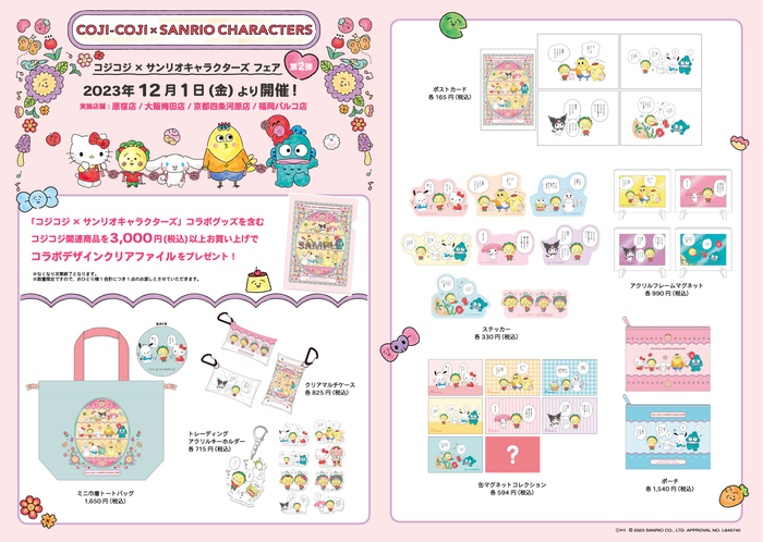 2023年12月1日(金)より、コラボレーションイラストを使用した新グッズを販売する「コジコジ×サンリオキャラクターズフェア 第2弾」をキデイランド4店舗で実施いたします。ミニ巾着トートバッグやポーチなど日常使いできるものから、どれが出るか楽しみなトレーディングアクリルキーホルダーまで、新商品が多数登場。キデイランド限定のお買い上げ特典もご用意しております。