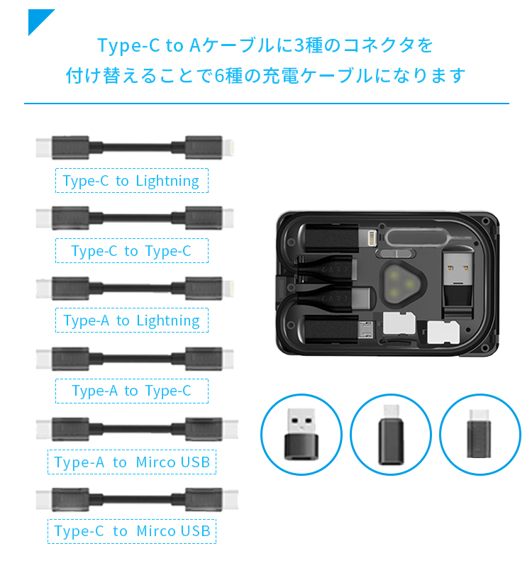 Type-CtoCケーブルに3種のコネクタを付け替えることで6種の充電ケーブルになります。