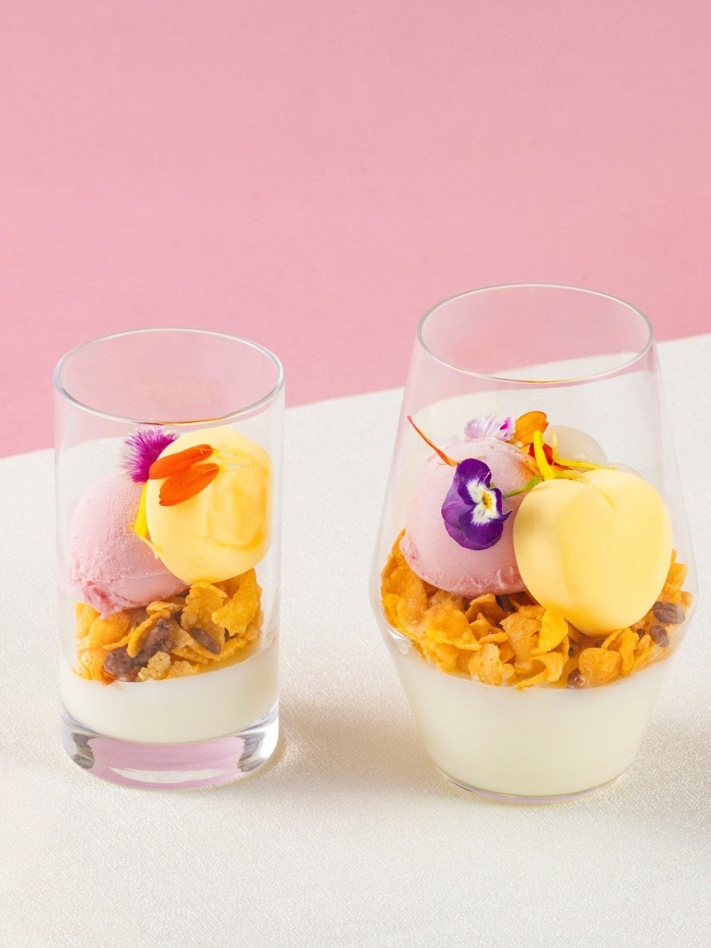 桜リキュール香るパンナコッタの上に、コーンフレーク、桜アイス、抹茶わらび餅、白玉を重ね、チュイールをのせた、見た目も春らしいパフェです。