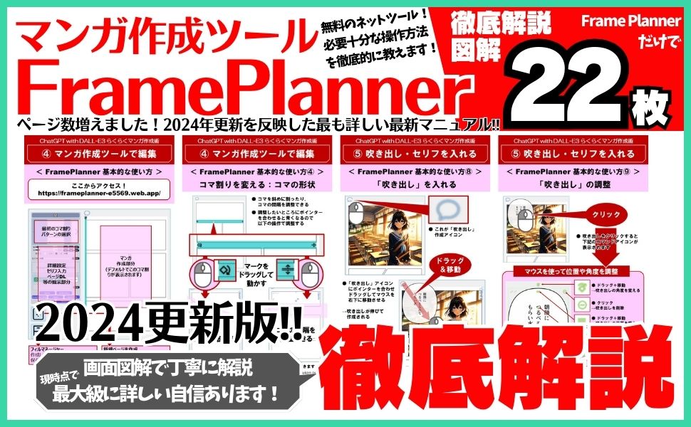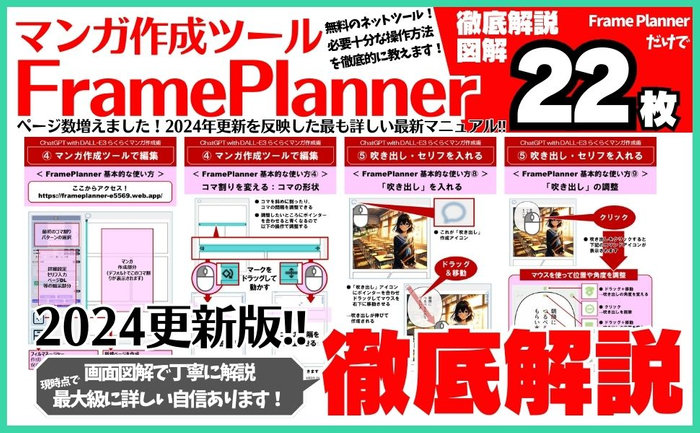 マンガ作成のネットツール「FramePlanner」を図解22枚で詳細に解説しています。視覚的にもわかりやすく、初心者に最適の入門書となっています。ChatGPTの画像作成機能とFramePlannerでのマンガ作成の方法を理解すれば、自分でマンガを作成することも夢ではありません。