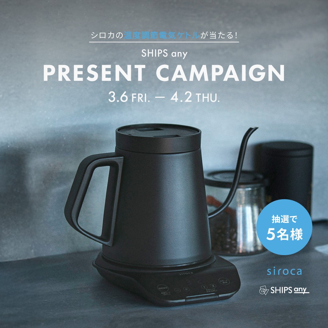 またSHIPS any 各店舗では、3月6日(金)~4月2日(木)までの期間中、税込5,000円以上お買い上げで、ご応募いただいた方の中から5名様にシロカの「温度調節電気ケトル」が当たるプレゼントキャンペーンを実施いたします。