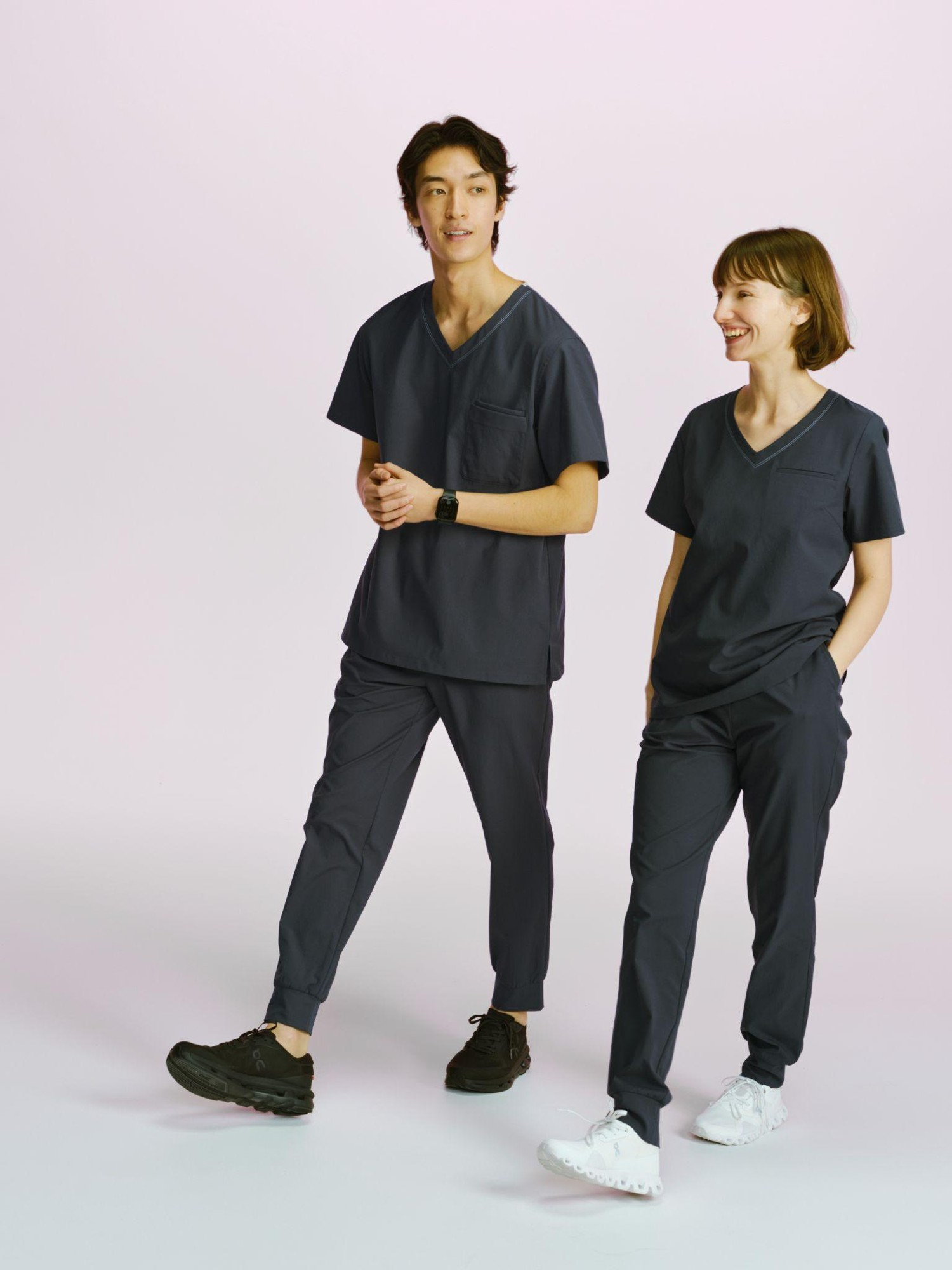 トップスは肩ボタンと腰ポケットをなくしたシンプルなデザイン、パンツは動きやすさを追求したジョガータイプのデザインを採用しました。