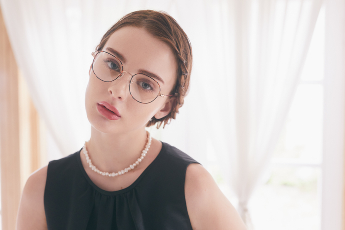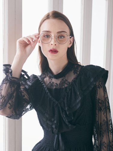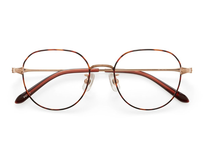 クラウンパント型で、よりクラシカルなニュアンスを加え、ヒンジ部分はすずらんやフリルをモチーフにしたフォルムになっています。レンズ周りにはメタルの上に七宝や転写を施し、顔に華やかさをプラス。