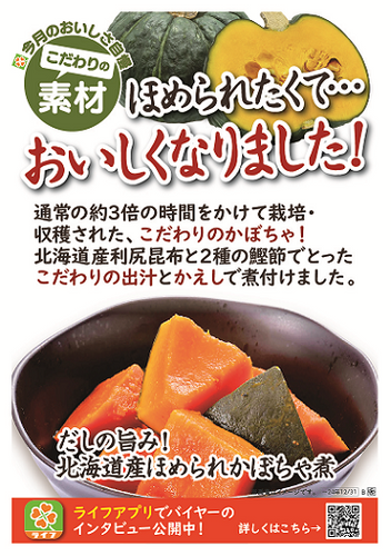 “おいしい” “ワクワク” “ハッピー” をお届けするライフコーポレーションは、惣菜とインストアベーカリー“小麦の郷”の12月の「おいしさ自慢」商品として、「だしの旨み!北海道産ほめられかぼちゃ煮」と「マルゲリータ」をリニューアルいたしました。