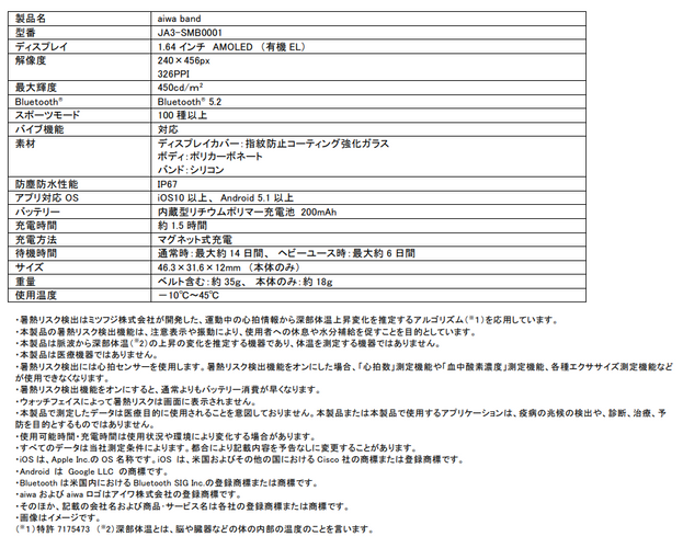 テクミラホールディングスの子会社であるアイワマーケティングジャパン株式会社(本社:東京都千代田区、代表取締役社長:藤岡 淳一、以下 アイワマーケティングジャパン)は、aiwaの新製品として、暑熱リスク対策や運動の記録など生活を便利に彩る多機能スマートバンド【aiwa band】(以下 本製品)を、aiwaダイレクトサイトおよび各家電量販店、ネットショッピングサイトにて本日から順次販売開始いたします。