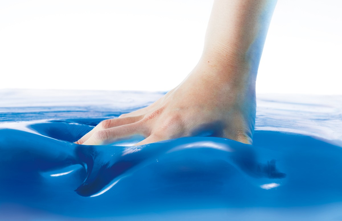 Technogelの特長は、”液体”のように動きながら、”固体”のように形状を保つ、という点にあります。ぷにぷにしたジェルが上下左右と3次元的になめらかに変形し、オーダーメイドしたかのように使う人の体のフォルムに合わせて形を変えます。