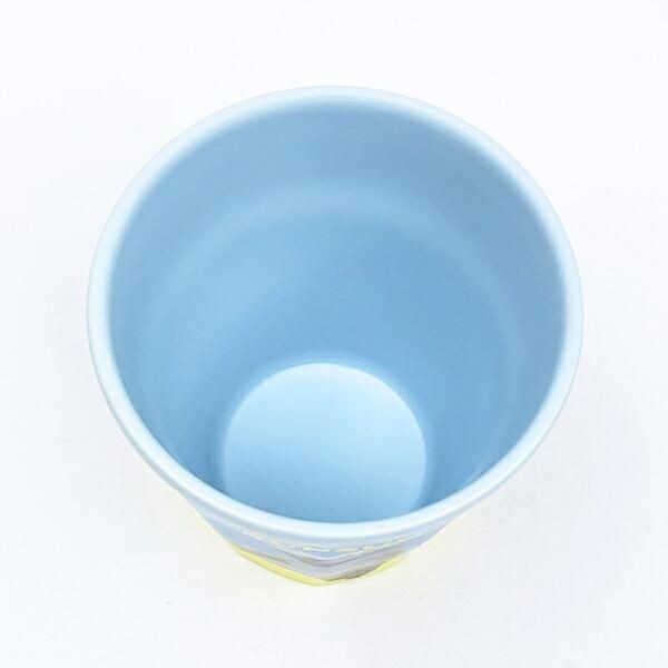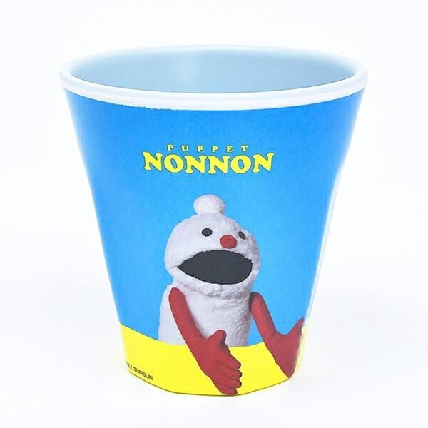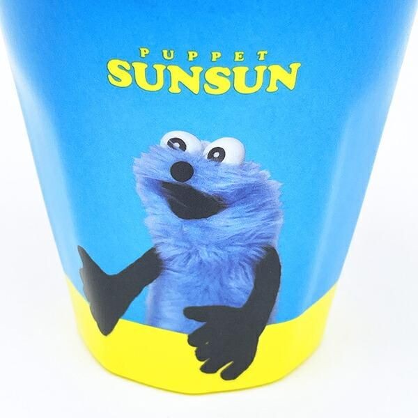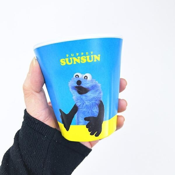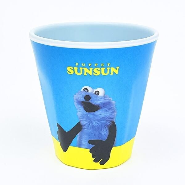 軽くて丈夫なメラミン製のパペットスンスンのコップ。水色と黄色の組み合わせが鮮やかで、なんだか気分が明るくなってきます。