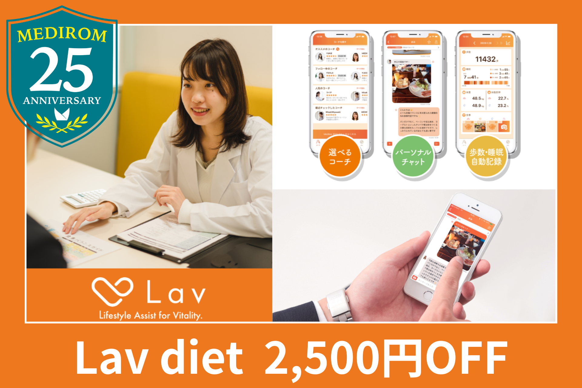 株式会社MEDIROM MOTHER Labs(本社:東京都港区、代表取締役社長:植草義雄、以下「マザーラボ」)は、親会社である株式会社メディロム(本社:東京都港区、代表取締役:江口 康二、米国Nasdaq上場 NASDAQ: MRM 以下「当社」)の創業25周年を記念して、ヘルスケアアプリ「Lav」で使える2,500OFFクーポンを配布いたします。