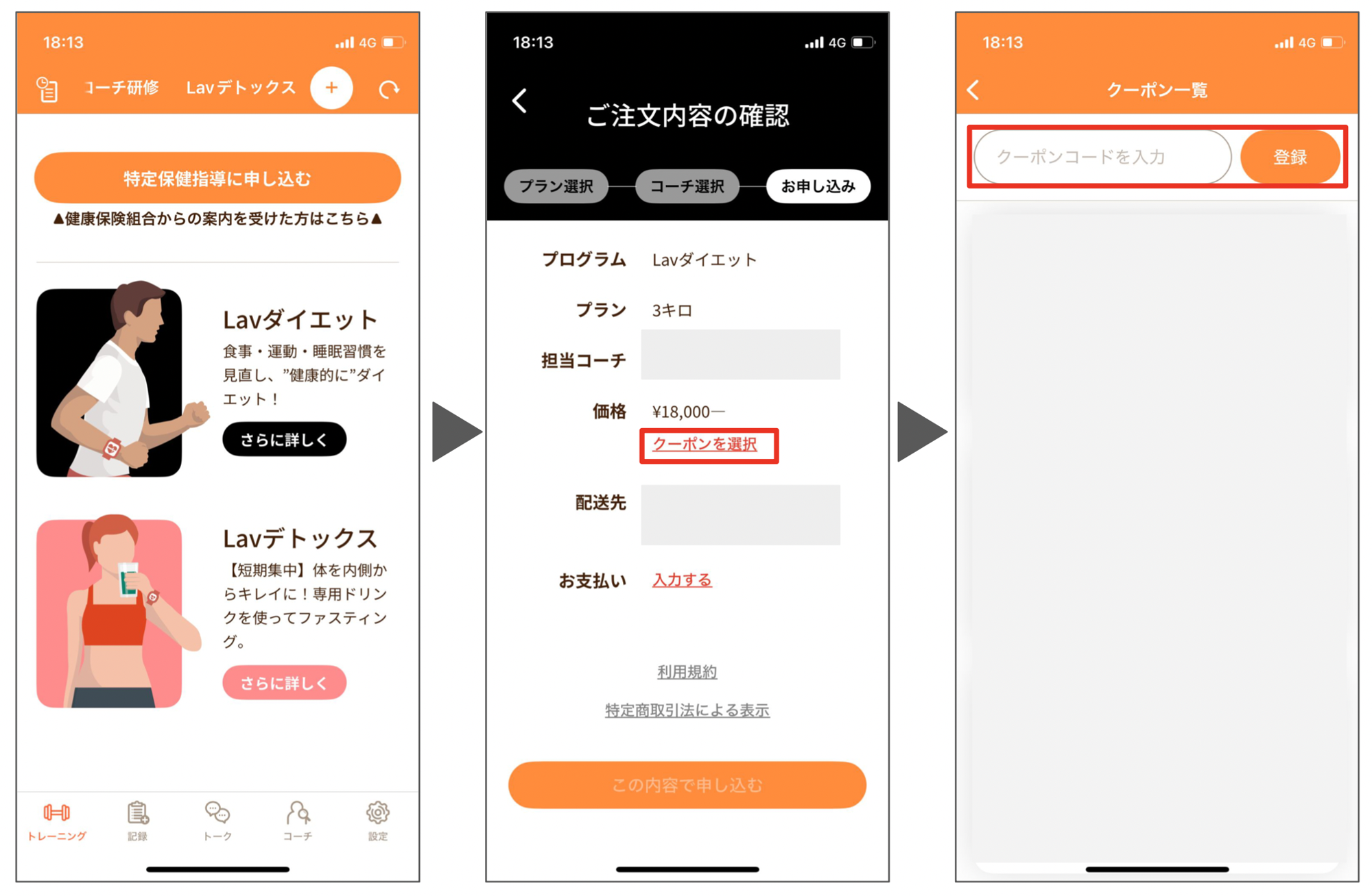 ■方法:Lavアプリから「トレーニング」を選択し、ご希望のプランとコーチをお選びいただいた後、お申し込み画面にてクーポンを選択してください。クーポンコードを入力してお申し込みいただくと、その場で2,500円割引が適用されます。
