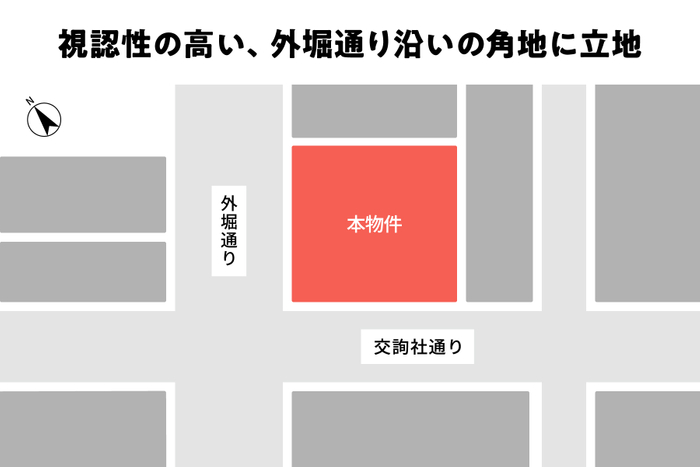 「交詢社通り」との交差点の角地に面しているため視認性が高く、飲食・物販両テナント獲得において優位な立地です。 また一方で、東京駅、有楽町駅、新橋駅からのアクセスがよいことから、外堀通り沿いのエリアはオフィス用地としても適しています。