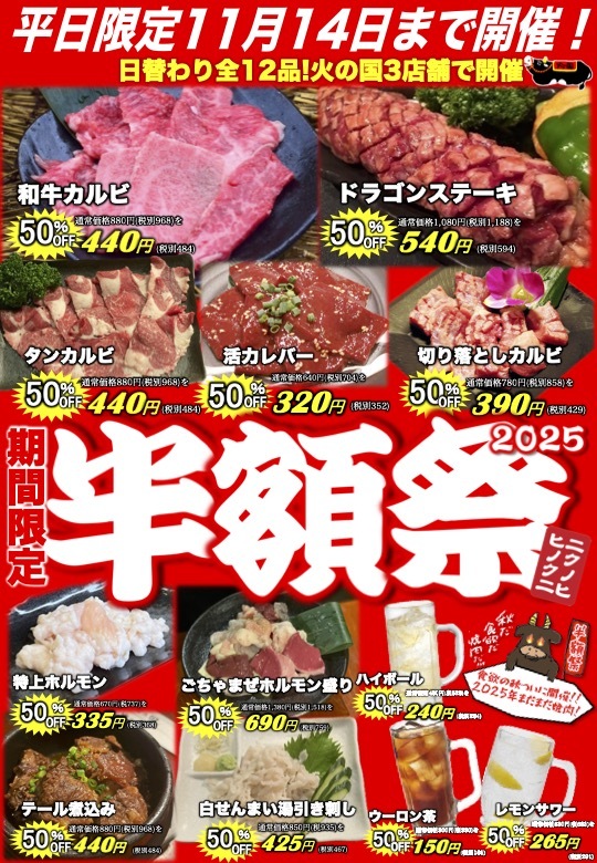 静岡県で10店舗の飲食店を展開する株式会社ランドマーク(本社:静岡県浜松市、代表取締役:森 幸太郎)が【炭火焼肉火の国】3店舗(中田本店、初生店、今之浦店)で2025年3回目の半額祭を2025年10月1日(水)~11月14日(金)に開催いたします。
