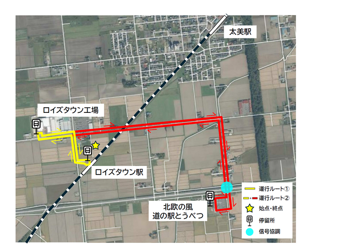 本実証運行は、JRロイズタウン駅からロイズタウン工場前へのルートと、JRロイズタウン駅からロイズタウン工場前を経由し北欧の風道の駅とうべつへとつなぐルートの2ルートを、運行時間を変えて行います。