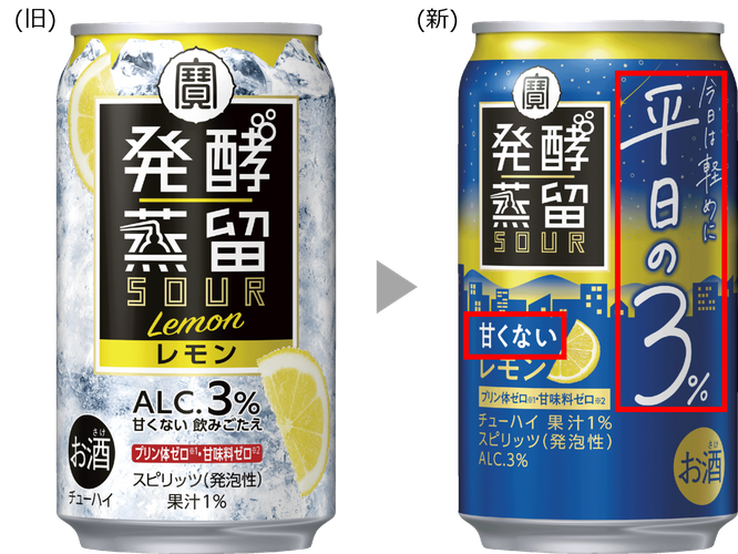 今回、“アルコール分3%で甘くなく、お酒の満足感が楽しめる、平日にぴったりなチューハイ”という商品コンセプトをより分かりやすく表現するため、~平日の3%~というサブネームを商品名に追加するとともに、パッケージデザインをリニューアルします。