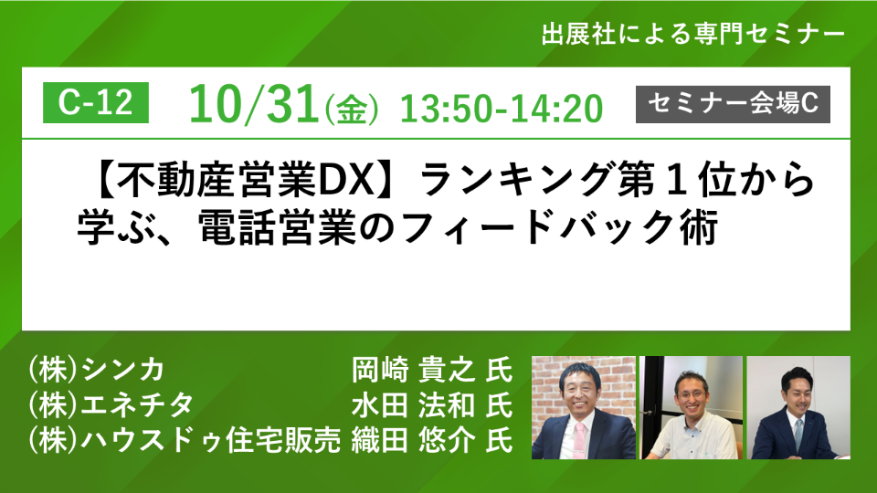 シンカは、この「カイクラ」を活用した「電話営業を成功に導くフィードバック術」をより多くの不動産会社様に知っていただくため、「BREX関西」に出展いたします。会期中は、全国FC大会で2年連続で店舗総合ランキング第1位という実績を持つ株式会社エネチタ様、株式会社ハウスドゥ住宅販売様との特別対談セミナーを開催し、不動産業界の営業ノウハウについて解説します。