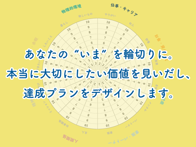 「人生の輪」は、自分の現状を映しだす鏡のようなもの。人生を支える代表的な要素(8領域16項目)にフォーカスして、現状の「満足度」と「理想」を視覚化します。さらに分析を行い、自己認識をアップデートすることができるので、そのポジションからどのように理想の未来を実現するのかを具体的に検討することができます。