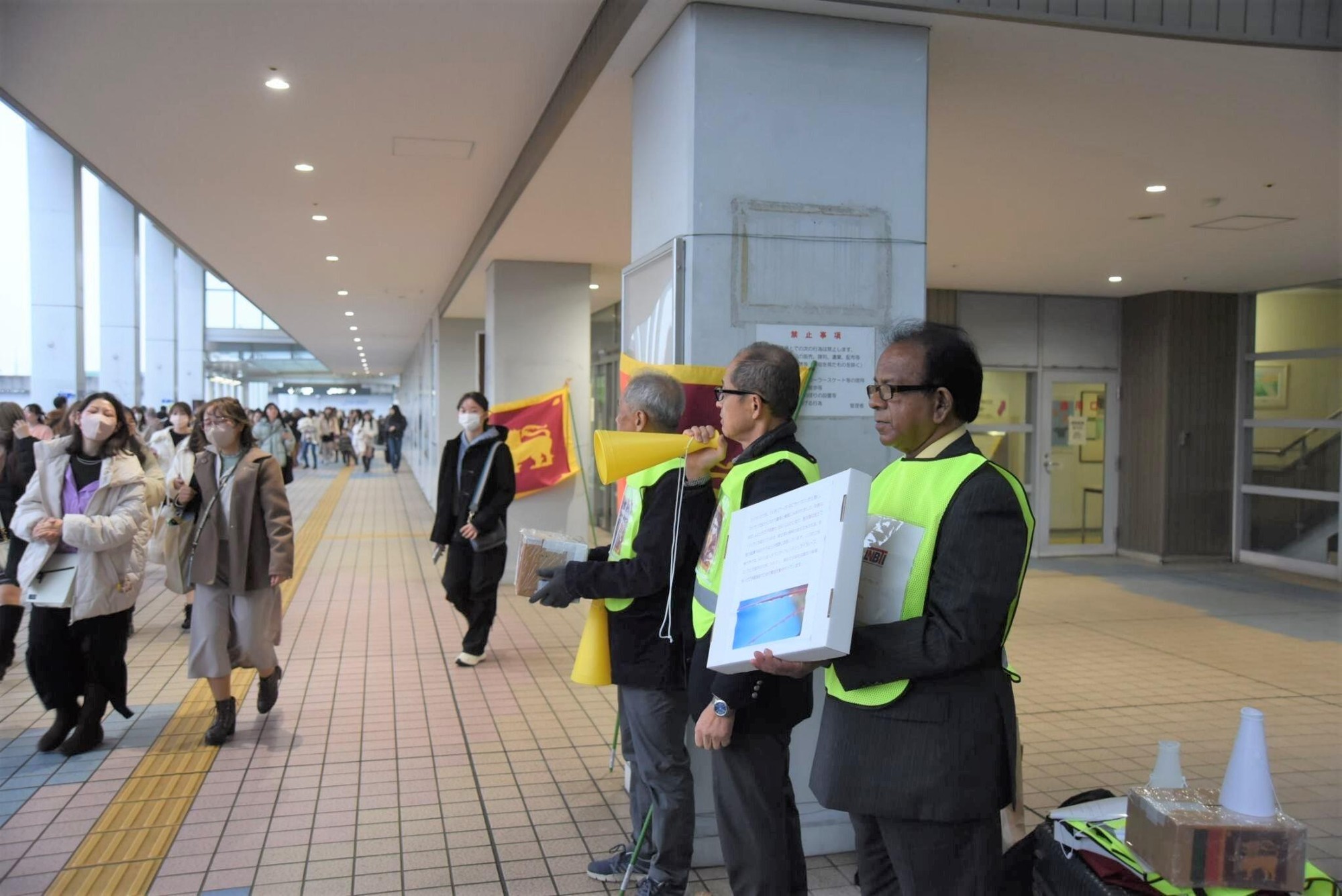 ナゴヤドーム前矢田駅からバンテリンドームやイオンナゴヤドーム前へとつながるペデストリアンデッキで、募金箱を手にしたボランティアの学生らは全員がひとまとまりになり、ペデストリアンデッキを通る買い物客や家族連れらに「スリランカでは安全な水や食料、住居が不足しています」などとスリランカの状況を訴えながら、約3時間にわたって協力を呼び掛けました。