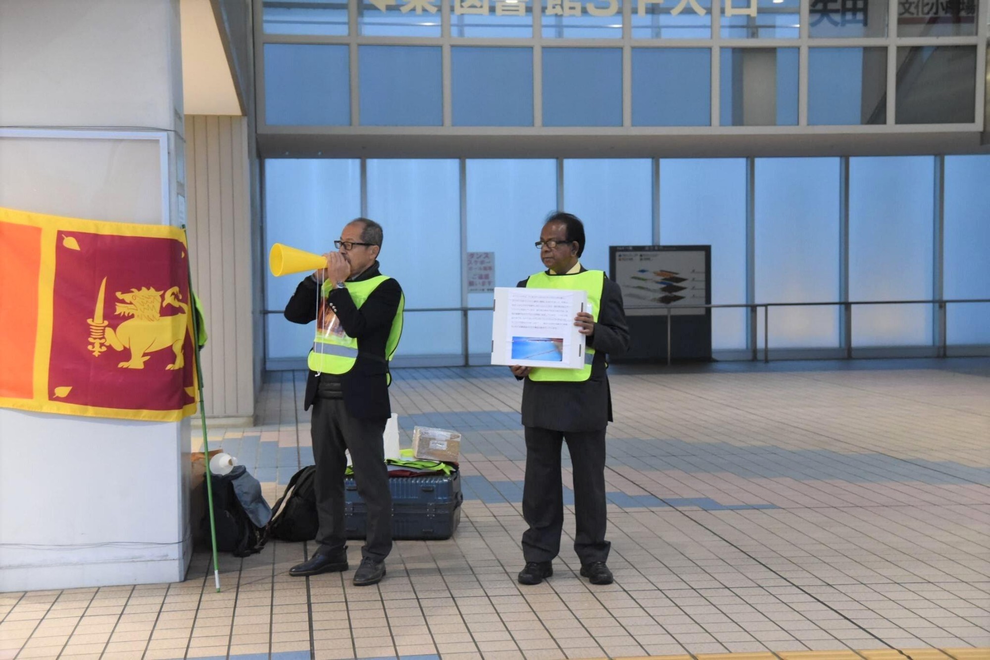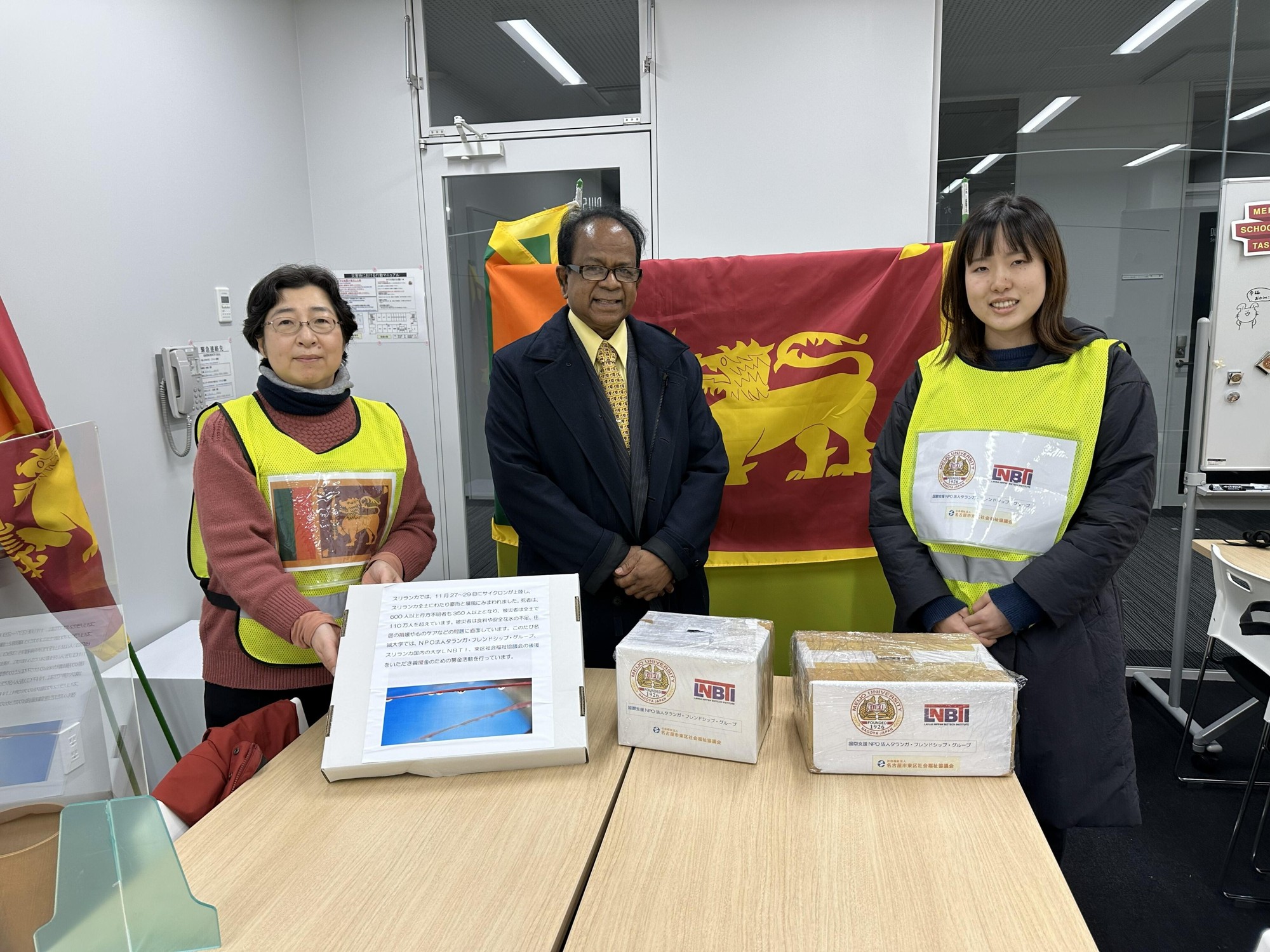 スリランカで11月末に発生した豪雨災害の被災者を支援しようと、本学の教員や学生らが12月20日、名古屋市東区のナゴヤドーム南北ペデストリアンデッキで、募金を呼び掛けるボランティア活動を行いました。本学外国語学部の初代学部長でスリランカ在住のアーナンダ・クマーラ名誉教授も駆けつけ、参加者は「スリランカの人たちは豪雨被害で大変な思いをされています。募金にご協力をお願いします」と市民に訴えました。