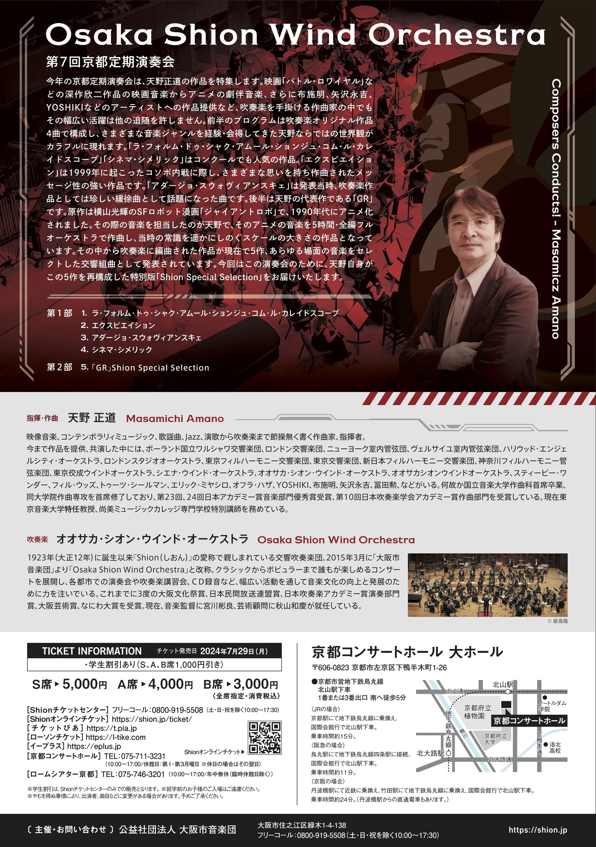 日本で最も長い歴史と伝統を誇る交響吹奏楽団のOsaka Shion Wind Orchestraを有する公益社団法人 大阪市音楽団(本社:大阪市住之江区/理事長:石井徹哉)は、指揮に作曲家の天野正道を迎え「第7回京都定期演奏会」を開催します。前半は吹奏楽オリジナル作品を、後半は「ジャイアントロボ」のアニメ音楽を特別バージョンでお届けします。ついにその詳細を発表!