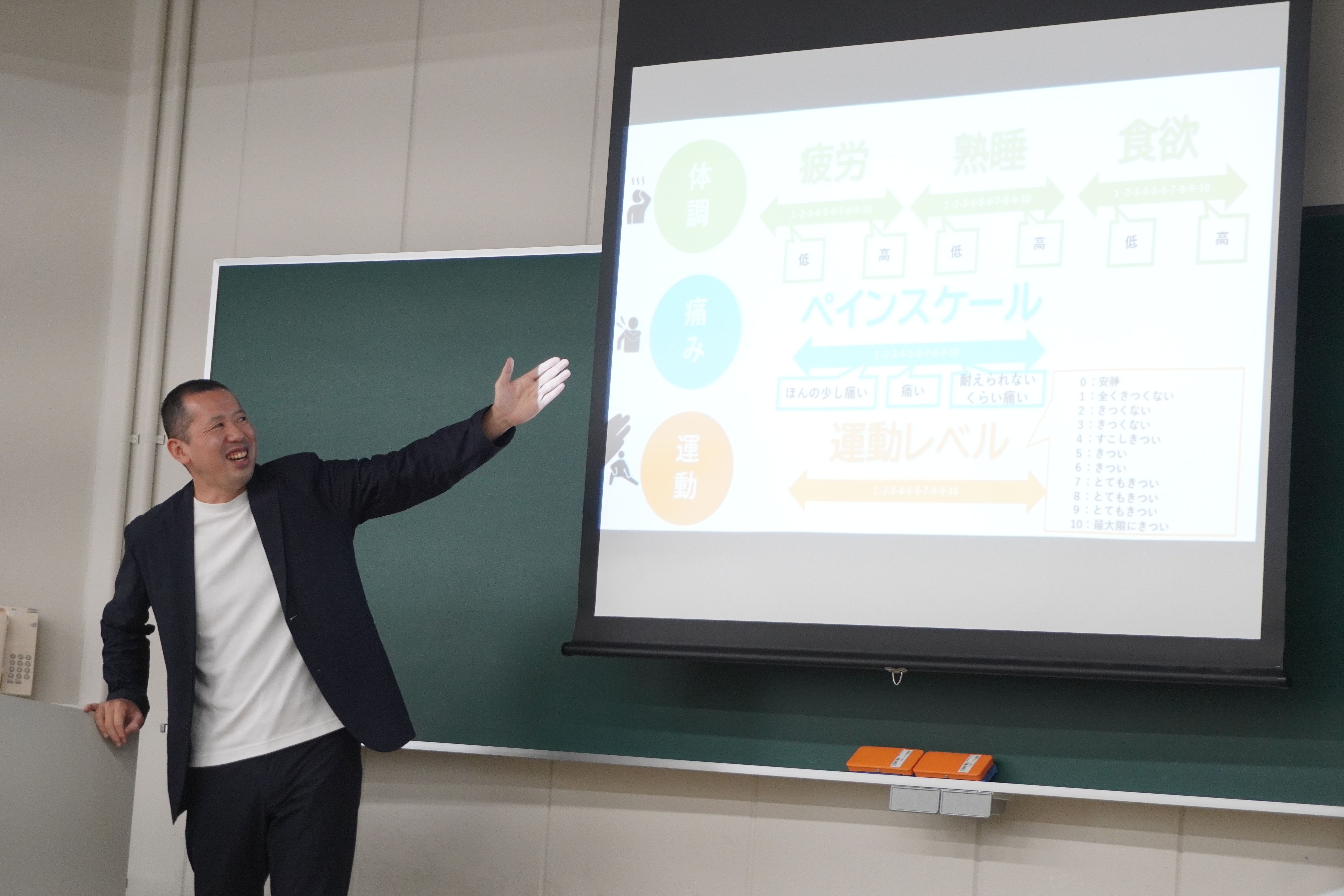 トレーナーになるために大切なことは、「自分自身を知ること」と泉氏。今回の講義では座学に加え、実際に選手に行っている運動を取り入れたワークを通じ、学生たちが自分の体や関節の動き、当日のコンディションや動かしやすさを体感し、理解を深めました。こうした体験を通じて、自分の状態を知ることが、選手へのケアにも役立つと説明されました。さらに泉氏からは、「今感じている疲労や睡眠を数値で表現すると?」「自分が一番リラックスできるケア方法は?」といった問いかけもあり、学生同士で意見を出し合い、自己認識を高めるとともに、他者の状態にも配慮する姿勢が促されました。実はこれも実際に選手に実施しているスクリーニングの一つで、体だけでなく心の状態も把握し、一人ひとりに適したケア方法を理解することも重要だと強調されました。選手としっかり対話を重ね、チームにリレーションしていくことが、最善のケアにつながるとのことでした。