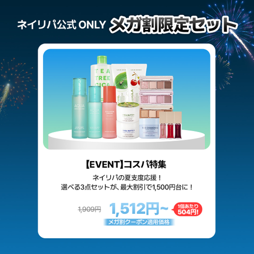 コストパフォーマンス抜群のメガ割限定企画が登場。メイクアップ、スキンケア、クレンザーの中からお好みのアイテムを自由に選べる3点セットが、最大割引でなんと1,500円台でご購入可能に。1点あたり約504円という圧倒的なお得感をお見逃しなく。