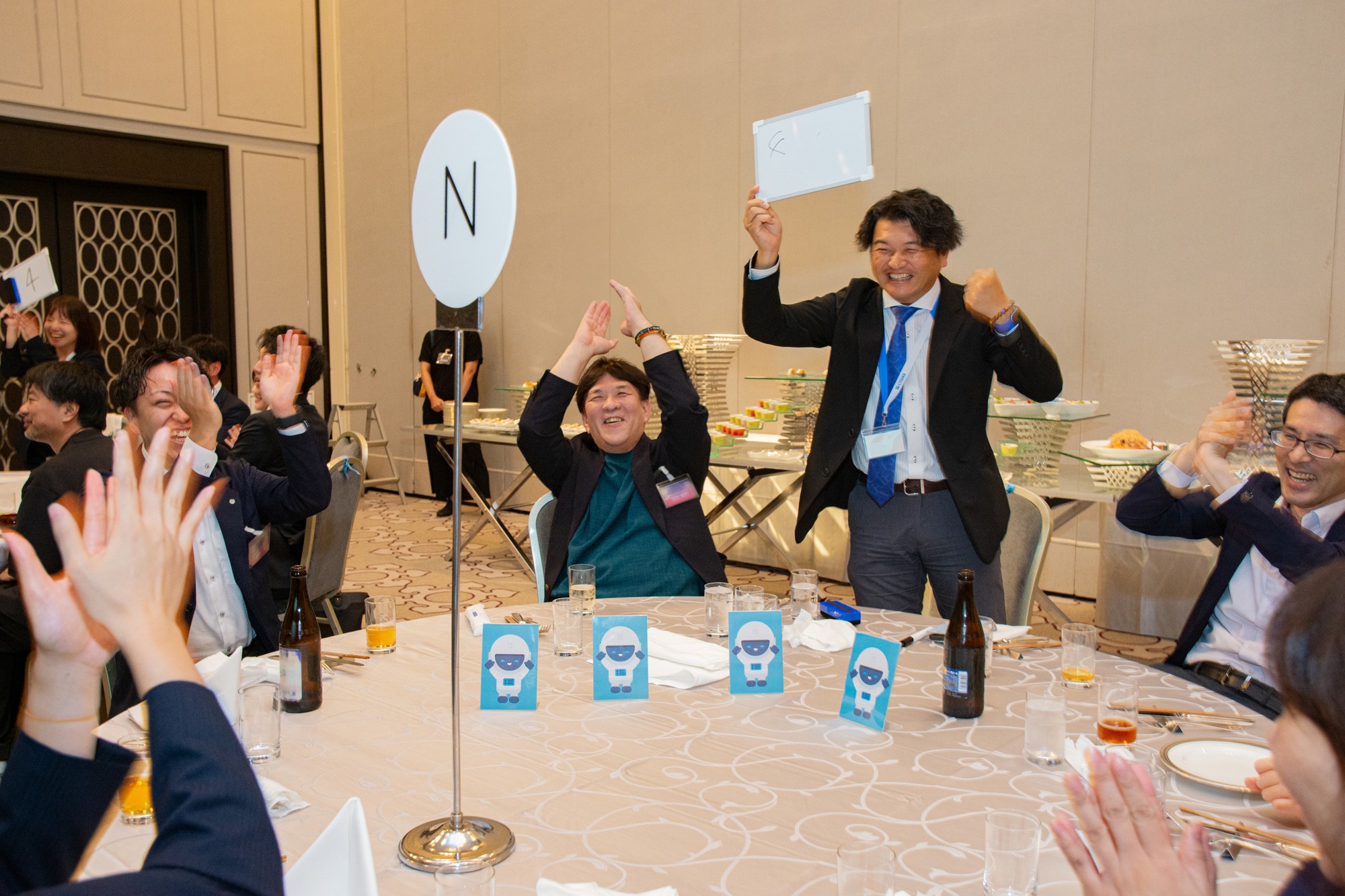 セッション終了後には、お客様同士やサイダス社員が食事を楽しみながら交流する懇親会が開催されました。お楽しみコンテンツとしてテーブル別対抗のクイズ大会が行われ、全問正解の卓が2組出るという結果に。