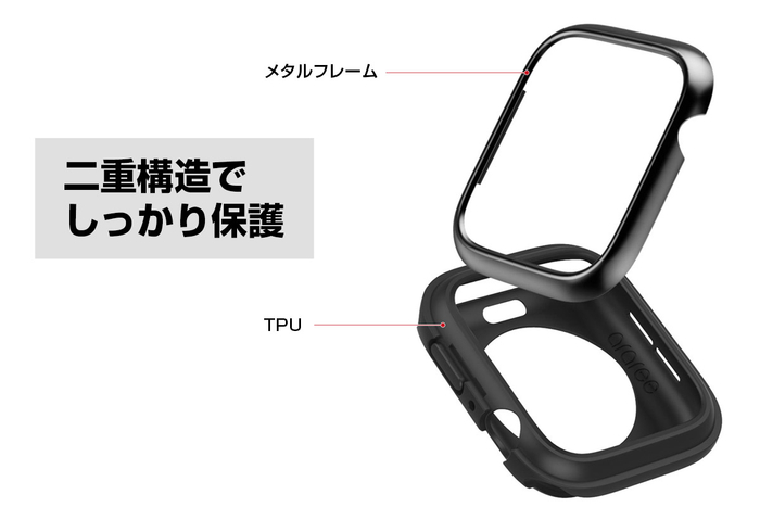 本製品は強靭なメタルフレームと柔軟なTPUカバーの二重構造設計で、Apple Watchを優しく包みながらも衝撃からしっかり保護するスタイリッシュなApple Watch用ケースです。