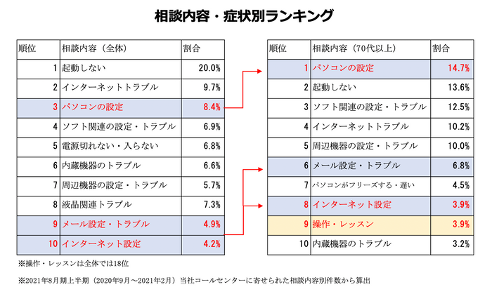 総務省統計局が発表した人口推計(2021年8月報)では日本人口の約32%が65歳以上のシニア世代と公表されています。当社は、年間16万件のパソコンなどデジタル機器のトラブル解決を行っており、そのうち約37%がシニア世代(60代以上)からの依頼です。シニア世代の相談内容を見てみると全体の相談と比較して「パソコンの設定、操作・レッスンが自分ではできない」といった相談の割合が多いという特徴があります。このことからパソコンの基本に躓いてしまうシニアが多いことが伺えます。