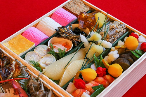 厚焼き玉子 / 紅白かまぼこ / 鶏松風 /結びのし梅 / 松葉刺し(長老喜・あみ傘柚子) / スモークサーモン錦糸巻き / 栗甘露煮 / 数の子 / 叩き牛蒡 /黒豆 / 田作り / 紅白なます /海老芋 / 寒筍 / 車海老 / 梅花人参 / 梅花長芋蓮根 / 堀川牛蒡 / 姫くわい / 絹さや / 菜種