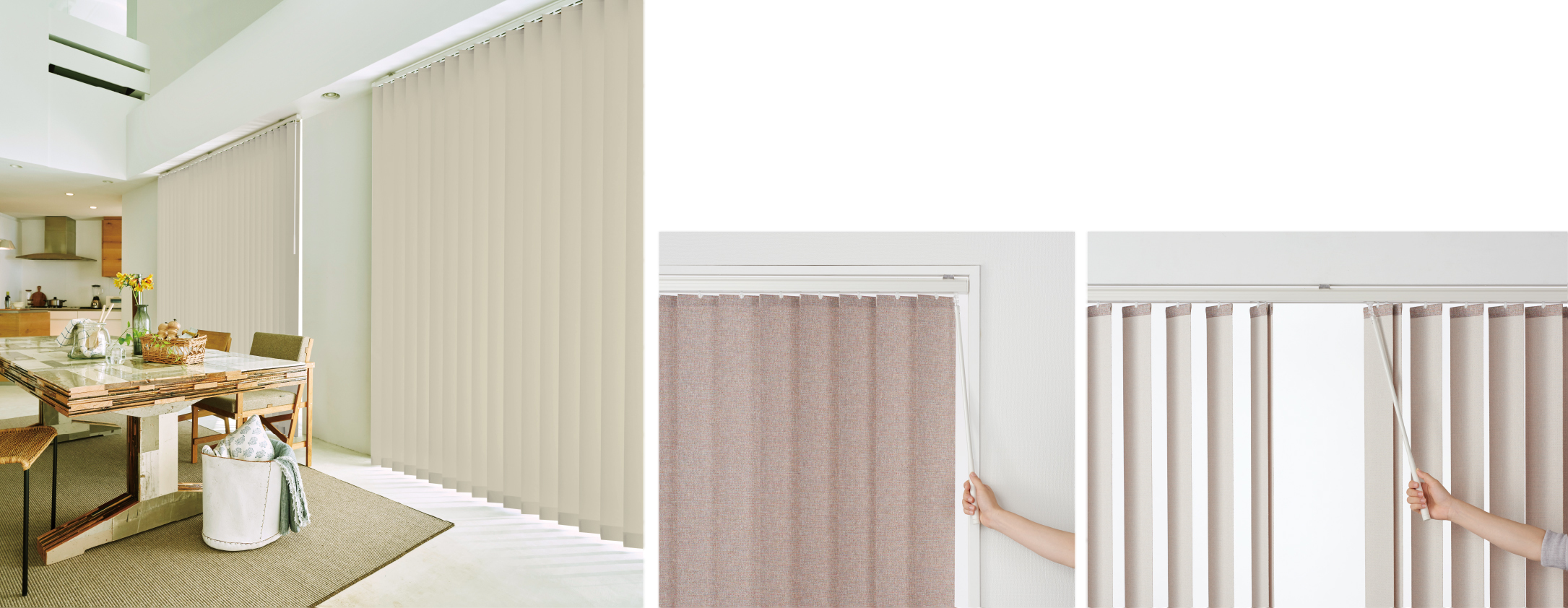 中央の操作バトンで両開き、左右のバトンでルーバーの開閉・回転操作ができる。操作部は小さなお子様の手が届かない高さにあり、ルーバーどうしをつなぐコードも無いため、引っかかる心配がない安全な商品。