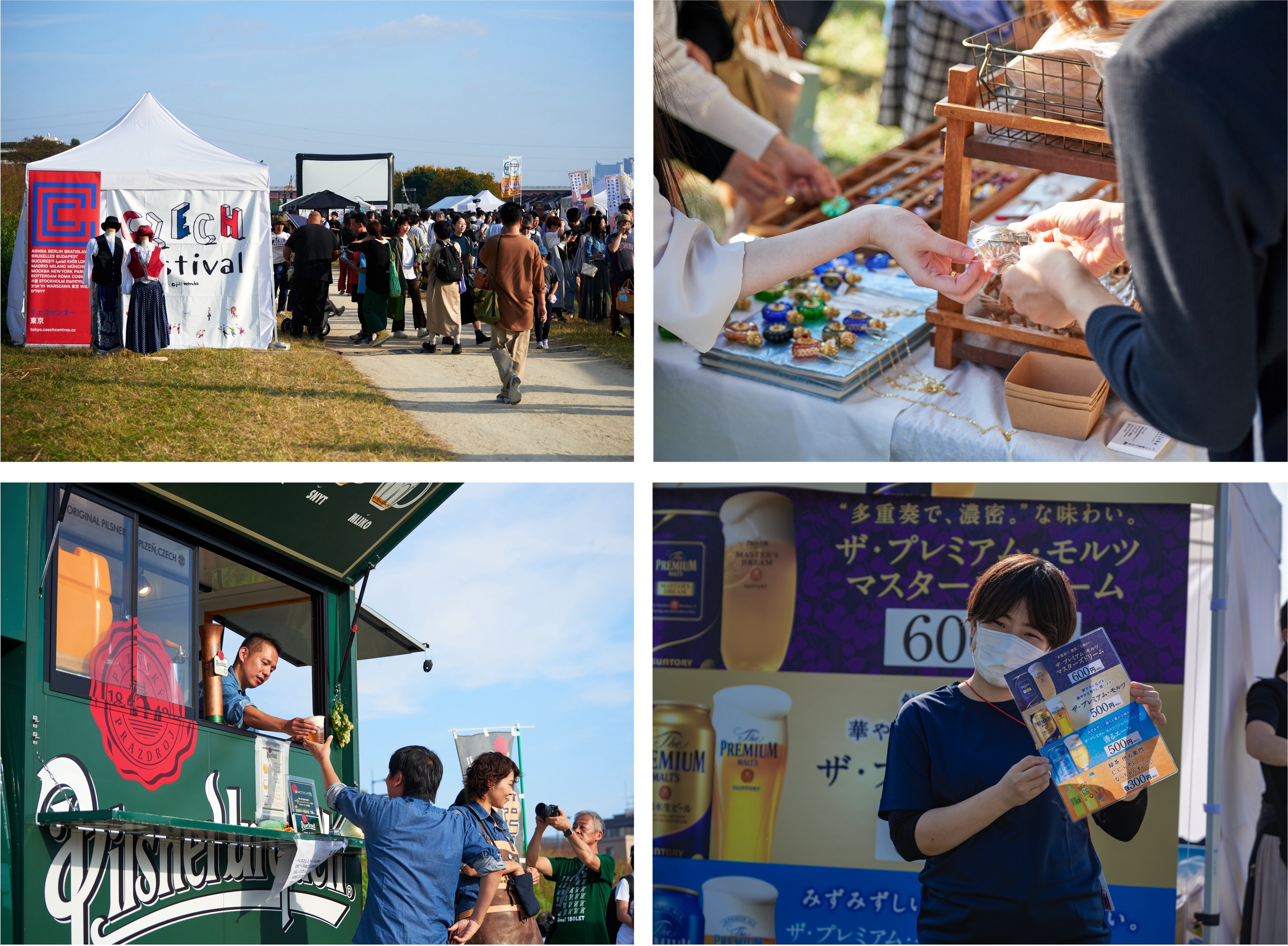 会場は昨年同様、キネコ国際映画祭会場内の多摩川河川敷(二子玉川公園前)。ガラスビーズなどのチェコ雑貨や、チェコの飲み物や食べ物が楽しめるブースが立ち並びます。チェコ産ホップを使用したザ・プレミアム・モルツをはじめ、チェコで一番人気のピルスナーウルケルやブランデーなど、チェコのお酒を飲みながら、ソーセージ、スープなどのチェコの定番の味をお楽しみください。お土産にチェコのお菓子もご購入いただけます。