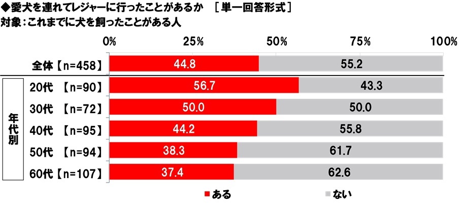 これまでに犬を飼ったことがある人(458名)に、愛犬を連れてレジャーに行ったことがあるか聞いたところ、「ある」は44.8%、「ない」は55.2%となりました。