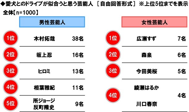 ■愛犬とのドライブが似合うと思う芸能人 男性芸能人1位「木村拓哉さん」、女性芸能人1位「広瀬すずさん」