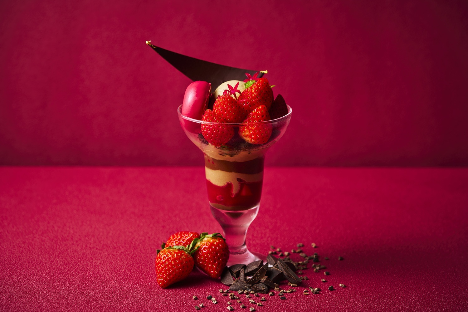 ラム酒香るチョコレートやコーヒーピーナッツのジェラート、旬の苺を贅沢に重ねた一品。口の中でふんわりと余韻が広がる、大人のためのご褒美パフェです。