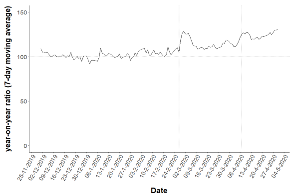 本研究では、図2の購買金額の前年比(7日移動平均)の時系列波形にみられるように、小中学校の休校宣言と第一回緊急事態宣言といった政府の介入直後に2度の購買が増加する機会を確認しました。一方で、この傾向は商品カテゴリ毎に異なっています。また、特に第2波ではStay homeの影響で恒常的に需要が増加した商品カテゴリが含まれます。そこで、商品カテゴリ毎に一時的な購買増加が起きているもの(急激に購買量(金額)が上がって、その後下がったもの)を抽出しました。これらの商品カテゴリには、ティッシュやトイレットペーパー、石鹸などの衛生品や乾麺、パスタ、小麦粉といった主食、缶詰やインスタント食品など保存のきく食品、ペット用品などが含まれています。