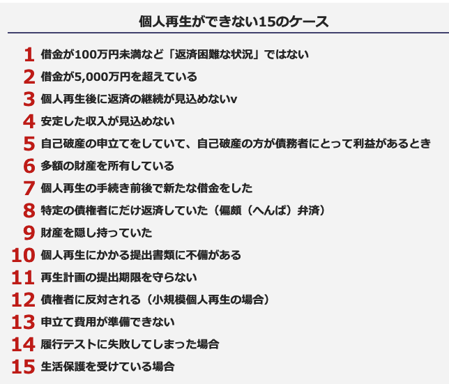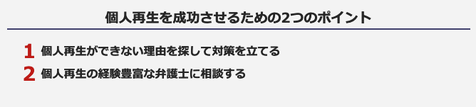 個人再生を成功させる確率を上げるためには、「個人再生ができないケース」で挙げた上記の①〜⑮のケースで自分に該当するものがないか確認し、失敗する要因をあらかじめ取り除いておくことが重要です。