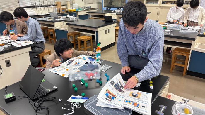 本講座では、高校で数学・物理を学ぶ意義を実感することを目的に、ロボットアームを有する移動ロボットを使って、理論を学び、理論に基づいたプログラミングを行いました。通常の授業でロボットに触れることはないため、試行錯誤しながらロボットを組み立てながらも、意欲的に取り組む姿が見られました。講義後のアンケートでは、「数学や物理の学びの先につながる応用や発展について、その一端をイメージできた」と全員が回答しました。