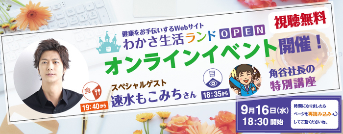 【参加無料】リニューアルを記念して、特別ゲストに速水もこみちさんをお迎えし、健康に関するオンラインイベントを開催