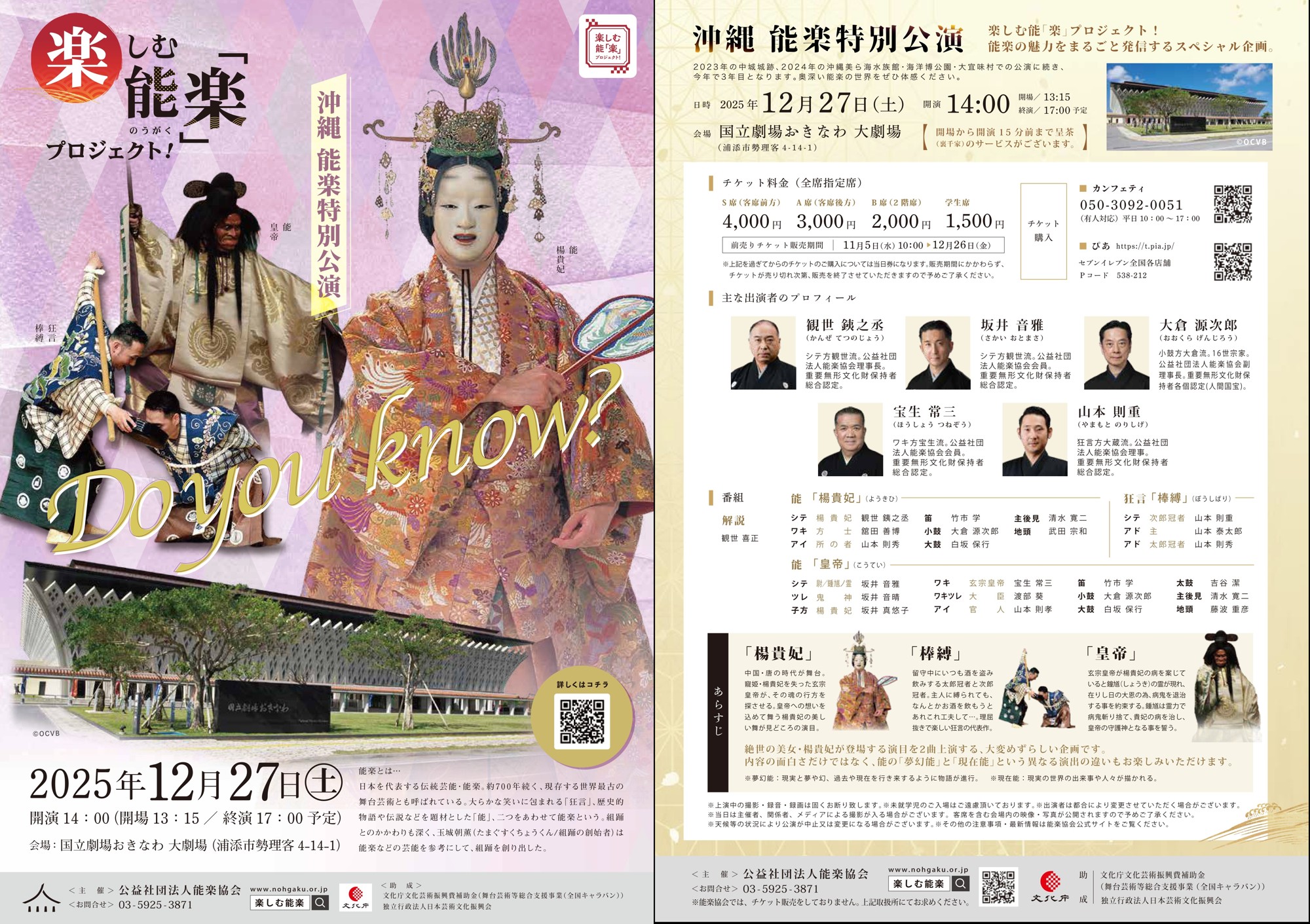 公益社団法人能楽協会主催、『楽しむ能「楽」プロジェクト!沖縄 能楽特別公演』が2025年12月27日 (土)に国立劇場おきなわ 大劇場(沖縄県浦添市勢理客4丁目14-1)にて上演されます。 チケットはカンフェティ(運営:ロングランプランニング株式会社、東京都新宿区、代表取締役:榑松 大剛)にて発売中です。