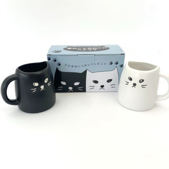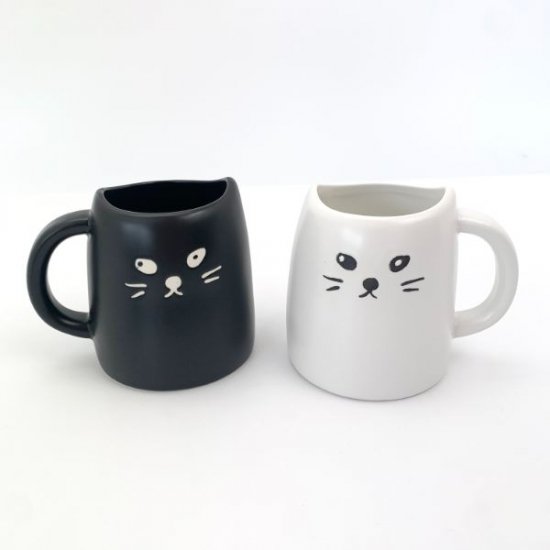 まずはこちらのマグカップから。黒猫と白猫がセットになっている商品です。位置づけとしてはペアマグになりますが、よくあるゴテゴテとした感じではなくシンプルなデザインだから年代性別問わずお使いいただけますよ。