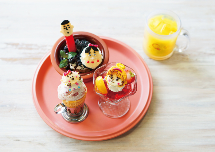 おかめちゃんの問答鉛筆フレンチトースト、ペロちゃんのストロベリーアイスクリーム、ルルのクランベリーゼリーのスイーツ盛り合わせ。彼女たちの魅力と個性を表現したデザートをお楽しみください
