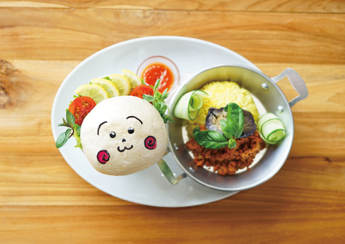 たま麩のコジコジフェイスをのせた、爽やかなレモンとトマトのフォーに茄子とビヨンドミートの肉味噌ごはんを合わせました。植物性の食材のみを使用したヘルシーなアジアンプレートです。