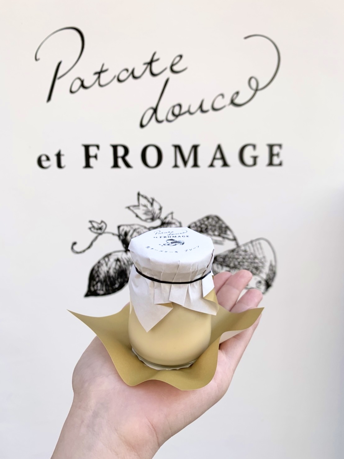 「Patate douce」はフランス語で「さつまいも」、「FROMAGE」はフランス語でチーズという意味です。二つの単語の間にフランス語で「and」の意味がある「et」を入れ、さつまいもとチーズを使ったスイーツ専門店ということを表現しています。