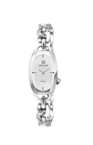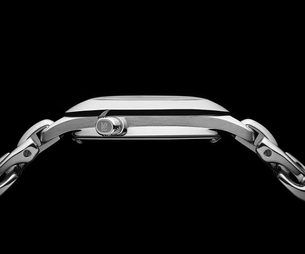 このモデルのオブロング(長方形)ケースは、優雅さと洗練を象徴しています。緩やかにカーブを描くフォルムは、どんな手首にも美しくフィットします。クラウンにはMarch LA.Bのシグネチャーである交差するラインが刻まれ、楕円形のデザインが特徴的です。また、ポリッシュとブラッシュ仕上げが施されたバックルと調和し、細部までこだわり抜かれたデザインが魅力です。