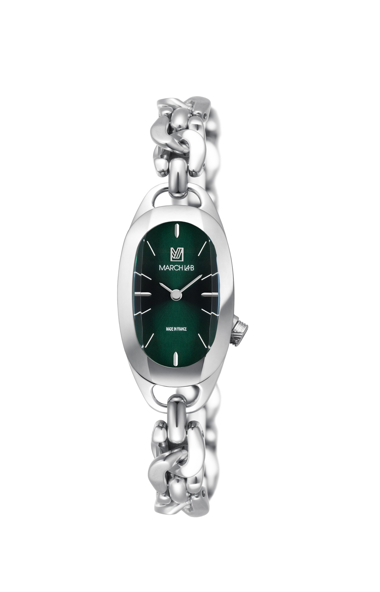 「オブロング」のダイヤルは、洗練されたミニマリズムを体現しています。シンプルでありながら、優雅さを極めたデザインは、March LA.Bの哲学を反映しています。中央には、さりげなくMロゴが配置され、スリムな針がダイヤル全体のバランスを引き立てています。ブレスレットには、ケースと同色のチェーンタイプを採用。時計との一体感を高め、より洗練された印象を演出します。スイス製の高精度クォーツムーブメントを搭載し電子振動によって正確な時を刻みます。温度変化に応じて振動数を調整するシステムを備えており、どんな環境でも安定した精度を維持します。また、長寿命のバッテリーシステムを採用し、約60ヶ月の駆動を実現。電池残量が少なくなると、秒針が4秒ごとにジャンプする「EOL(End of Life)」機能を搭載し、バッテリー交換のタイミングを知らせてくれます。