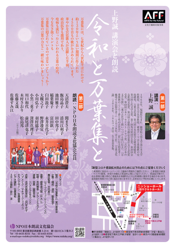 その「令和」と「万葉集」に焦点をあて、これまで和歌になじみがない方々にも理解しやすいよう、「万葉集を体感する」をモットーとする日本文学者上野誠氏の講演と、当協会会員の万葉集の朗読を会場の皆さんにお届けする。