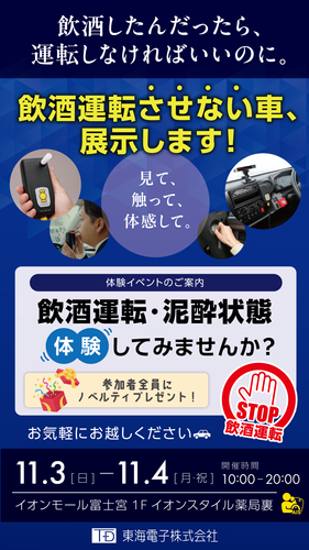 アルコール・インターロックの社会実装(違反者対策)のためのあらゆる活動と、アルコール問題を抱えた家族や親族を持つひとが、加害者家族にならない(被害者を生まない)ための予防活動を行う東海電子株式会社(本社:静岡県富士市 代表取締役 杉本 哲也)は、11月3日(日)11月4日(月・祝)にイオンモール富士宮にて、アルコール・インターロック搭載車の展示と飲酒運転・泥酔状態をご体験いただけるイベントを開催いたします。