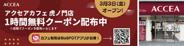 BizSPOTアプリのプレミアム会員に登録して、アクセアカフェ虎ノ門店をご利用のお客様は4月末までご利用料金が半額になります。